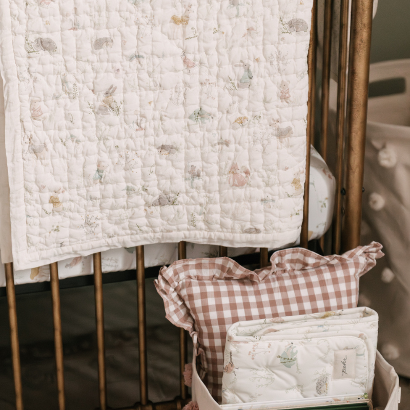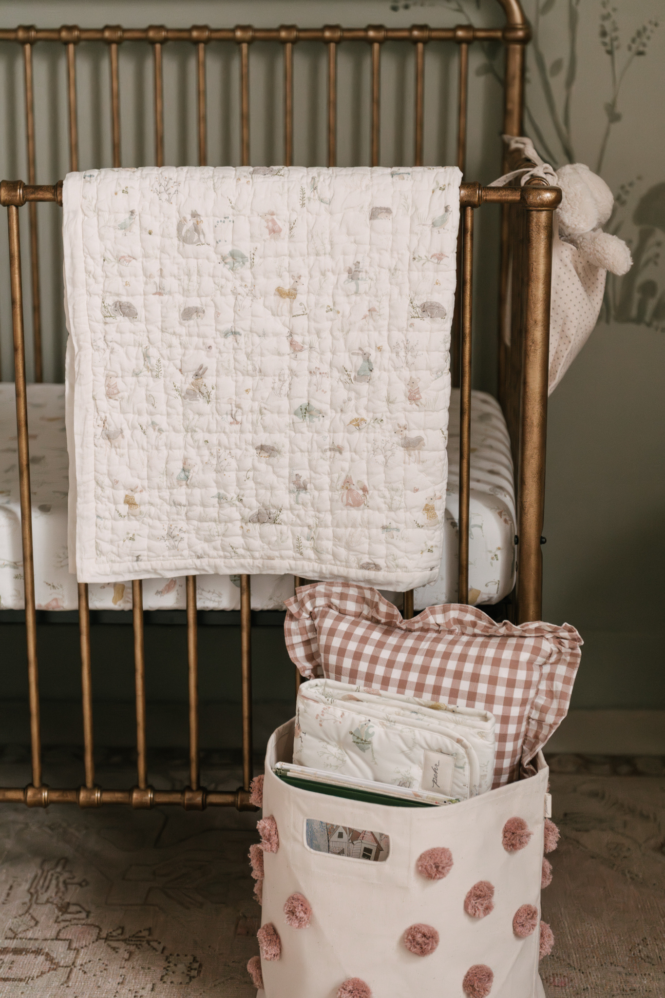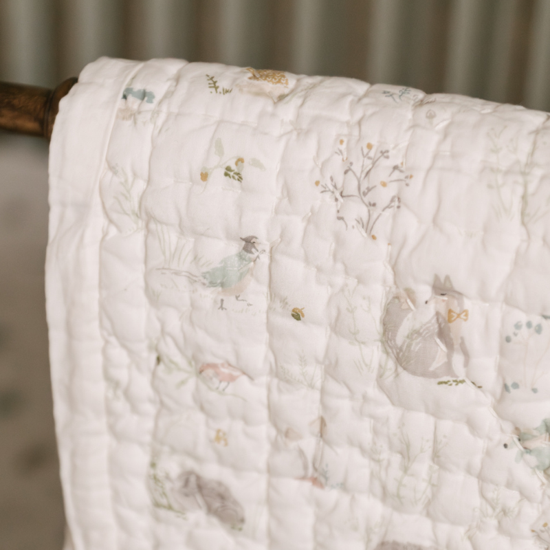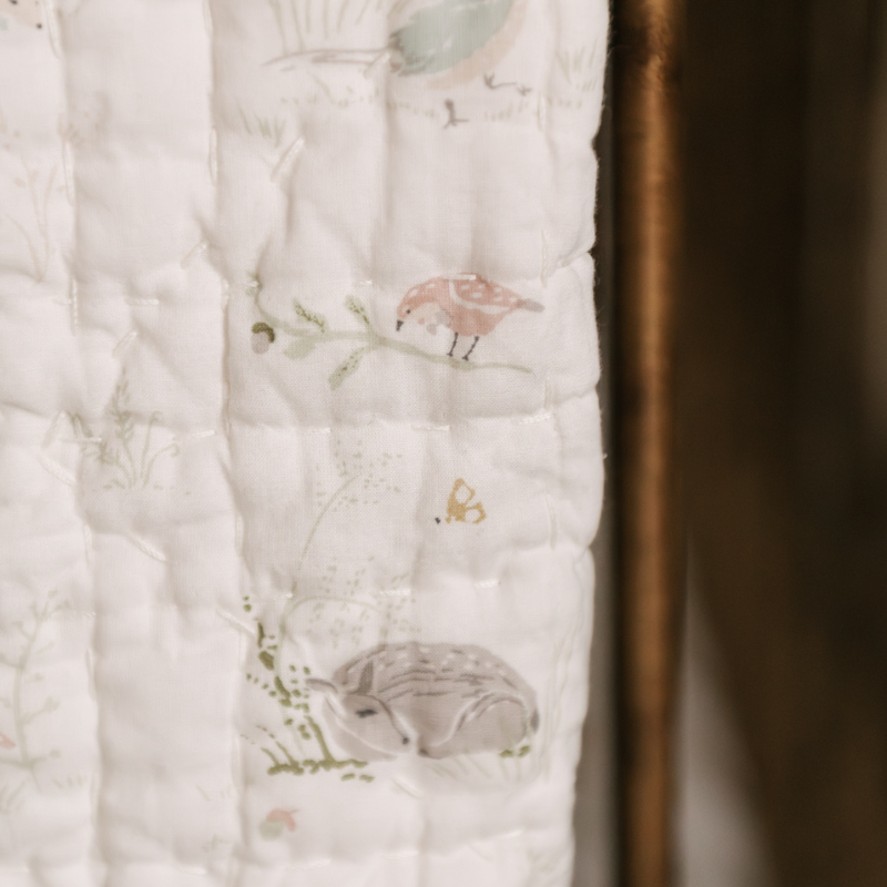 Bring a touch of woodland charm to your nursery with our Forest Fable Blanket. Made from 100% organic cotton, this quilted keepsake features our whimsical Forest Fable print on one side and a soft Ivory reverse for effortless styling. Hand-stitched quilting and a cotton voile flange add beautiful texture and craftsmanship, while the lightweight organic cotton fill makes it cozy for snuggles, tummy time, or adding a gentle layer of warmth.