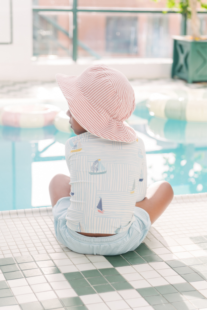 Sun safe and ready for play! Designed in the sweetest underwater prints, this two-piece swim set features a zip-front rash guard with a contrast neckline and relaxed-fit swim shorts with a drawstring for the perfect fit. Made from UPF 50+ fabric, its soft and stretchy feel, sustainable recycled fibers and zipper guard make for all-day comfort. ‘Pehr’ it with our Ponchos, Bucket Hats and Sandals for a head-to-toe beach day look.