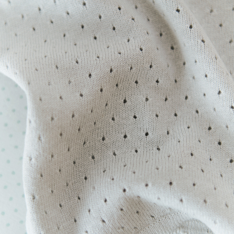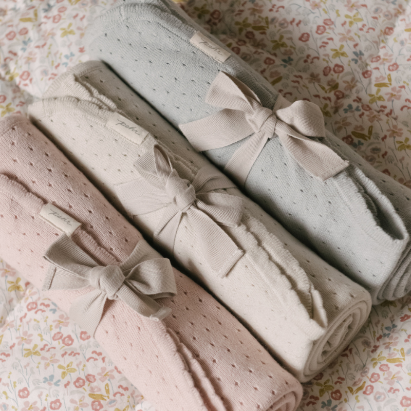 A forever favorite, made to remember the littlest moments. Our Pointelle Knit Blanket is crafted in the softest GOTS certified organic cotton-wool blend, gentle enough for baby’s delicate skin. Designed in a fine-gauge pointelle knit with an heirloom-inspired feel, it’s perfectly sized for snuggles, stroller rides, and cozy naps. Wrapped in a ribbon, it makes a timeless gift to cherish for years to come. Great for gifting with our Pointelle Knit Kimono Romper.