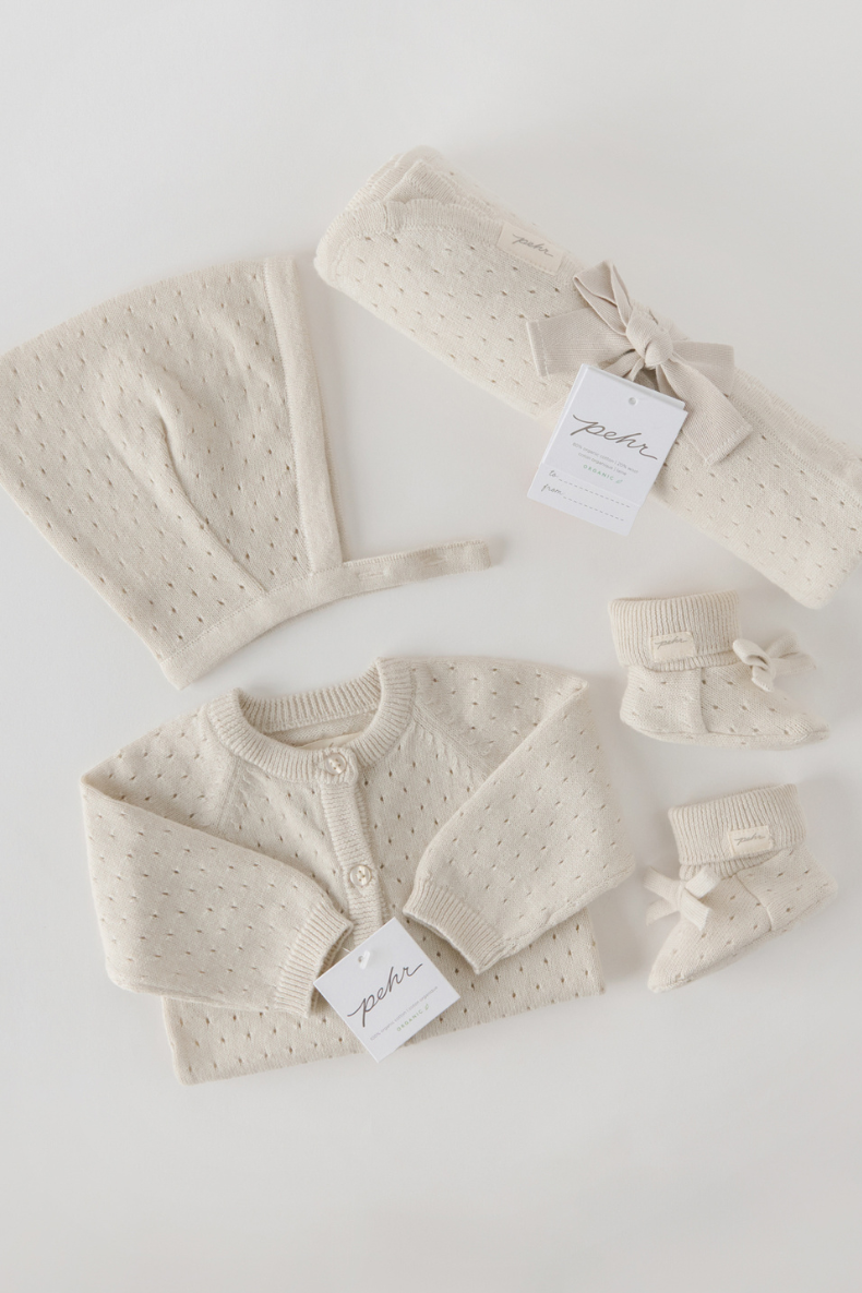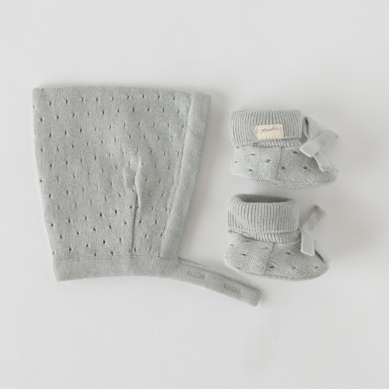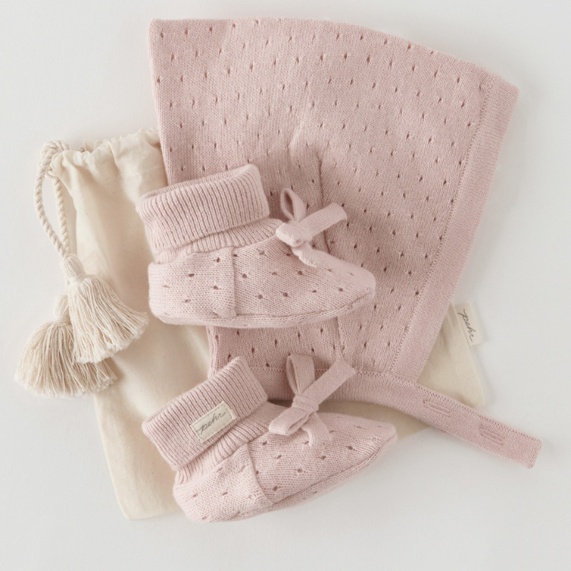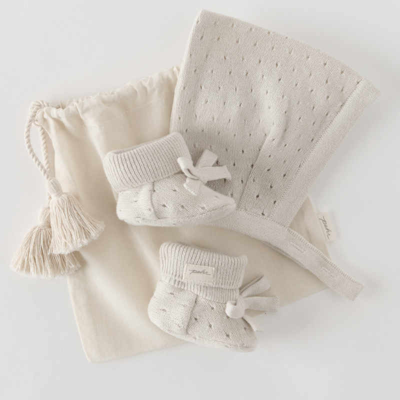Our Pointelle Knit Gift Set is a thoughtful way to welcome a baby. Made in the softest GOTS certified organic cotton-wool blend, this keepsake set includes cozy knit booties with a decorative bow and a classic bonnet with a buttoned chin strap for the perfect fit. Packaged in a fabric bag with a tassel drawstring, it’s a beautifully bundled gift for baby’s earliest days.