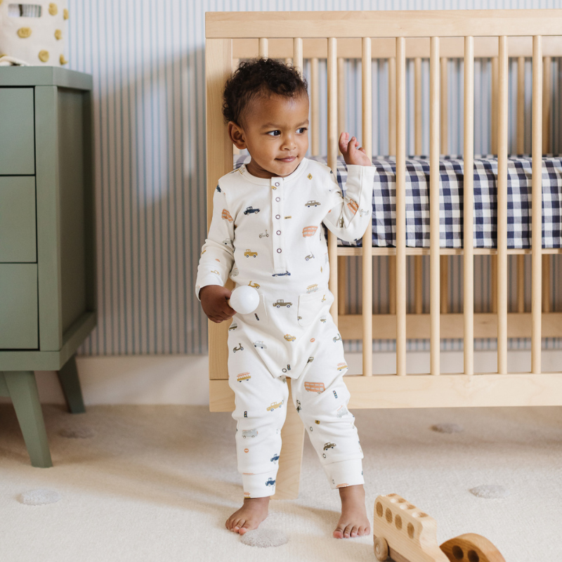 A cozy favorite, make to love and live in! Crafted from our softest GOTs certified organic cotton, the Henley Patch Pocket Romper is designed with brass snaps along the front and legs for easy changes. Two handy patch pockets add a playful touch—perfect for tiny treasures. Available in our bestselling prints that bring every detail to life. Pehr with booties to complete the look.