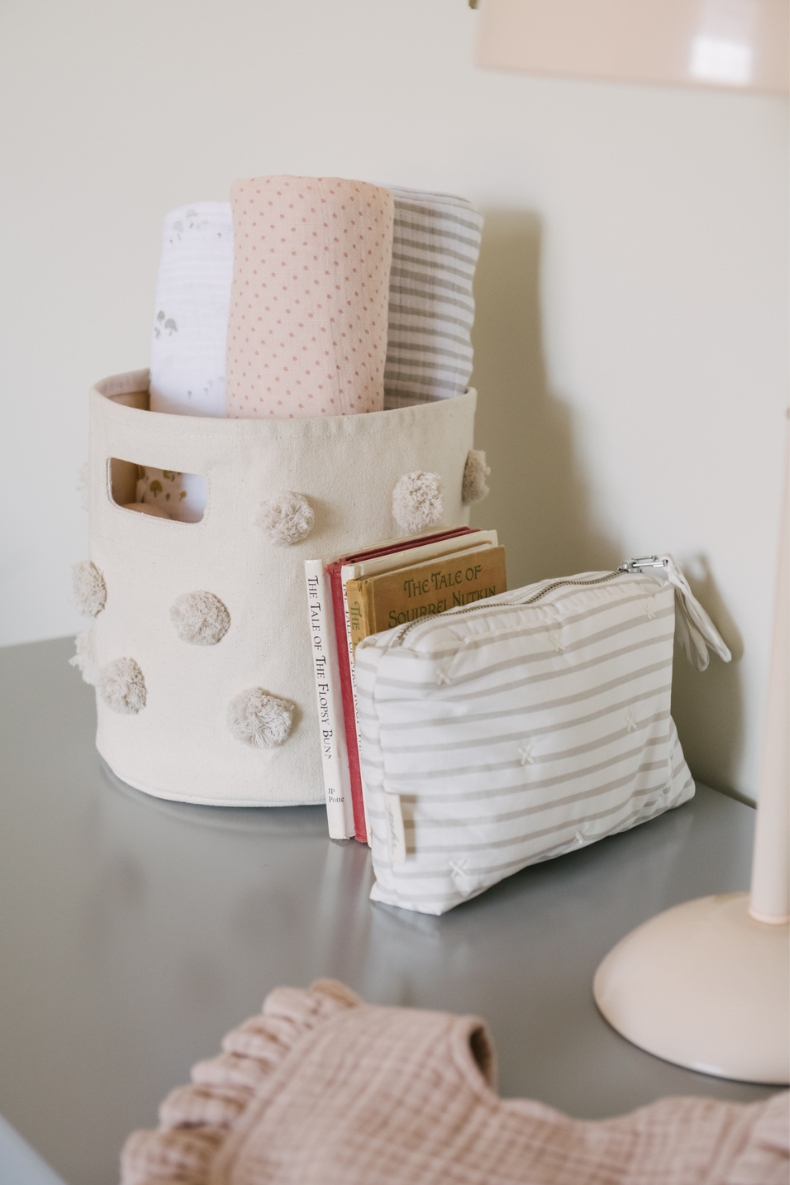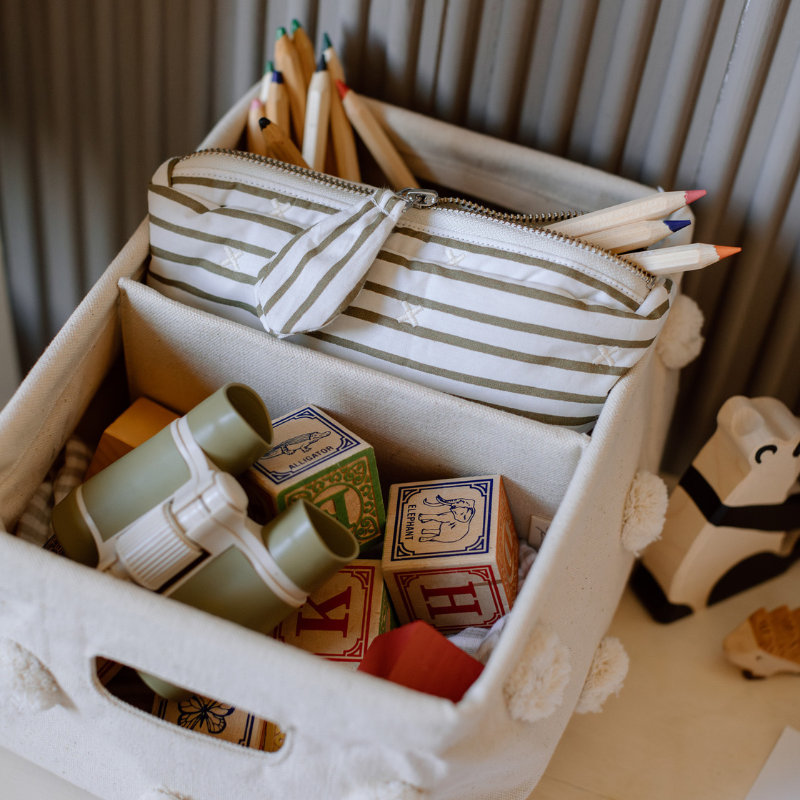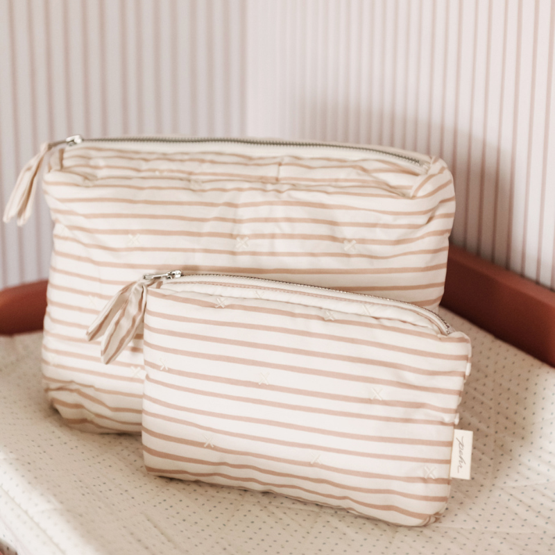 Meet the newest member of our On The Go family: the Mini Pouch, perfectly sized to keep all your smaller mom-and-baby essentials beautifully organized. At about half the size of our original On The Go Pouch, it features the same coated organic cotton, classic striped colors, and reliable zip closure you know and love. Thoughtfully designed with a 100% organic cotton exterior and hypoallergenic polyester fiberfill, this little essential brings effortless organization to every outing. For a complete travel-ready set, it pairs perfectly with our Changing Pads and Weekender Bag.