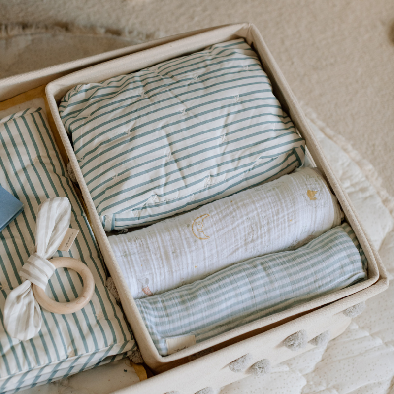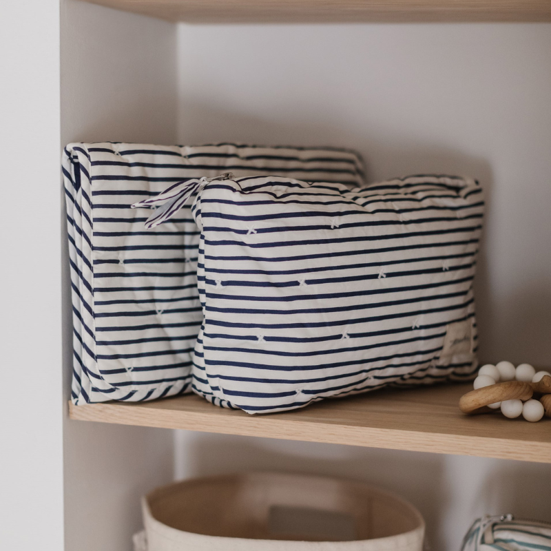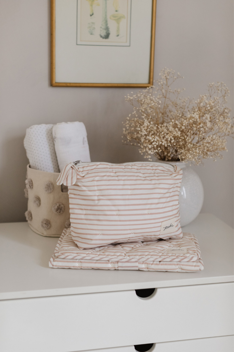 Meet the On The Go Set, thoughtfully designed to make travel with kids a little easier—while keeping all your essentials beautifully organized. Crafted from washable, wipeable coated organic cotton with hypoallergenic polyester fiberfill, this matching Stripes Away duo includes our bestselling Travel Pouch and Portable Changing Pad. Perfect for baby or for you, it brings effortless functionality and signature Pehr charm to every outing. For a complete travel-ready lineup, it pairs perfectly with our Diaper Bags.