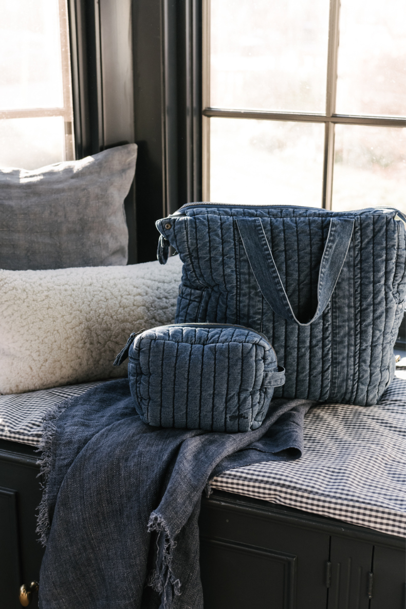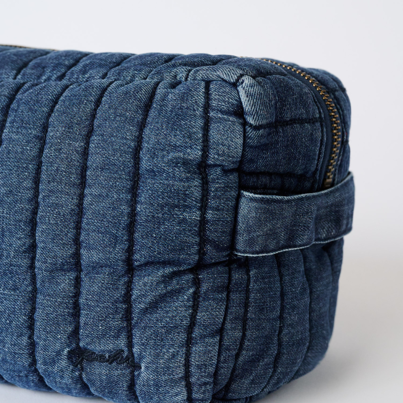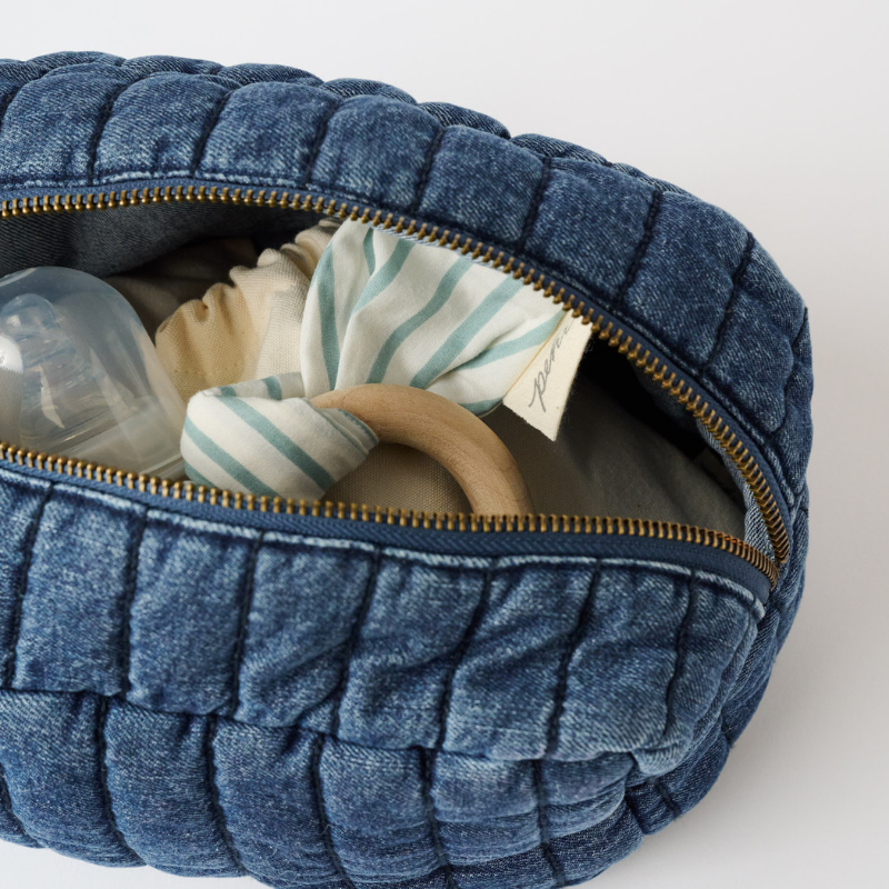 The Quilted Denim Pouch brings our Heritage Denim to life in a stylish, grab-and-go accessory perfect for keeping your essentials organized. Made from 100% organic denim inside and out, its boxy silhouette offers extra room for everything you need, while the quilted lining adds softness and structure. Thoughtful details—like the side handle, antique brass zipper, and subtle embroidered logo—bring effortless style to everyday organization. For seamless travel and easy outings, it pairs perfectly with our Convertible Diaper Bag.