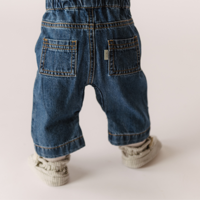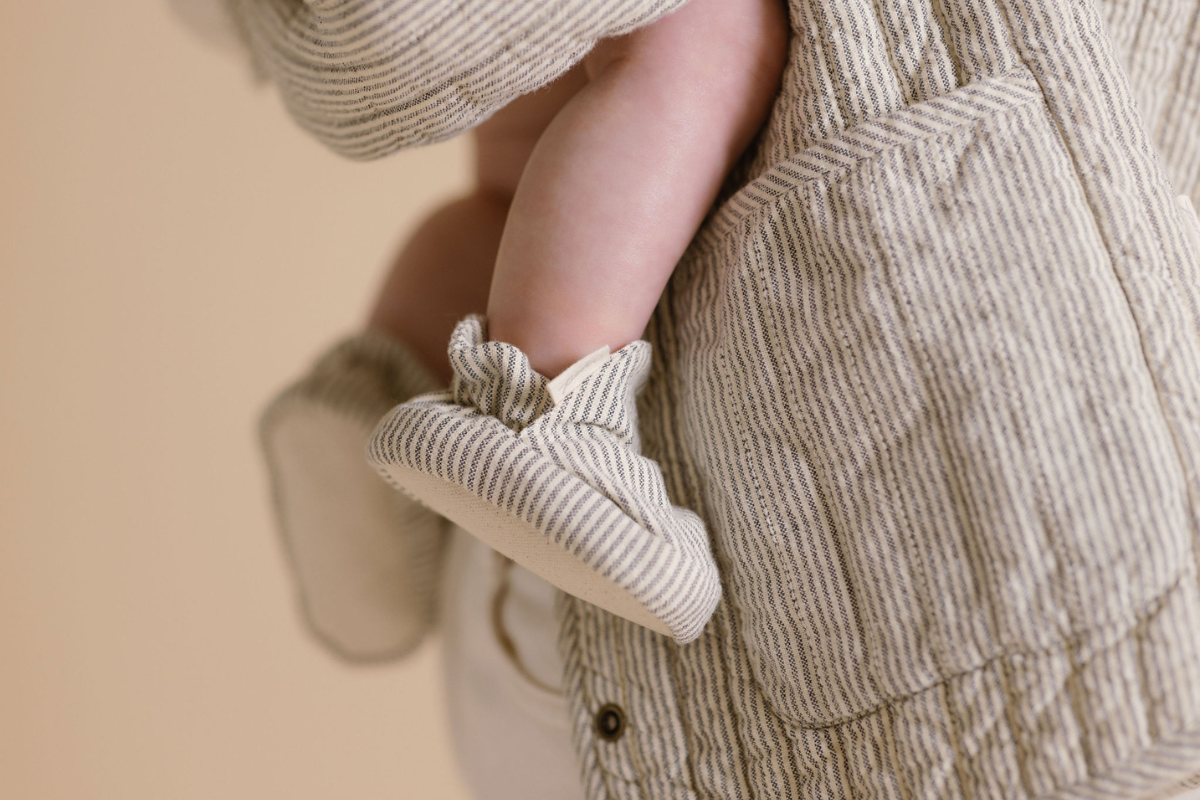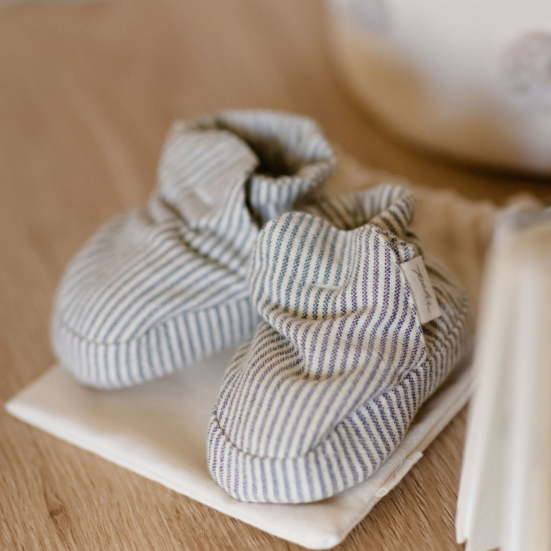 The sweetest baby booties for tiny toes. Our Railroad Booties are made from GOTS certified organic cotton in a soft, breathable railway stripe. Designed with an elasticized opening, they slip on easily and stay snug on wiggly feet. With a soft canvas sole, lined interior, and drawstring bag for storing, they’re the perfect finishing touch for any little outfit. Outfit your little one with our Railroad Baby Overalls to complete the look.