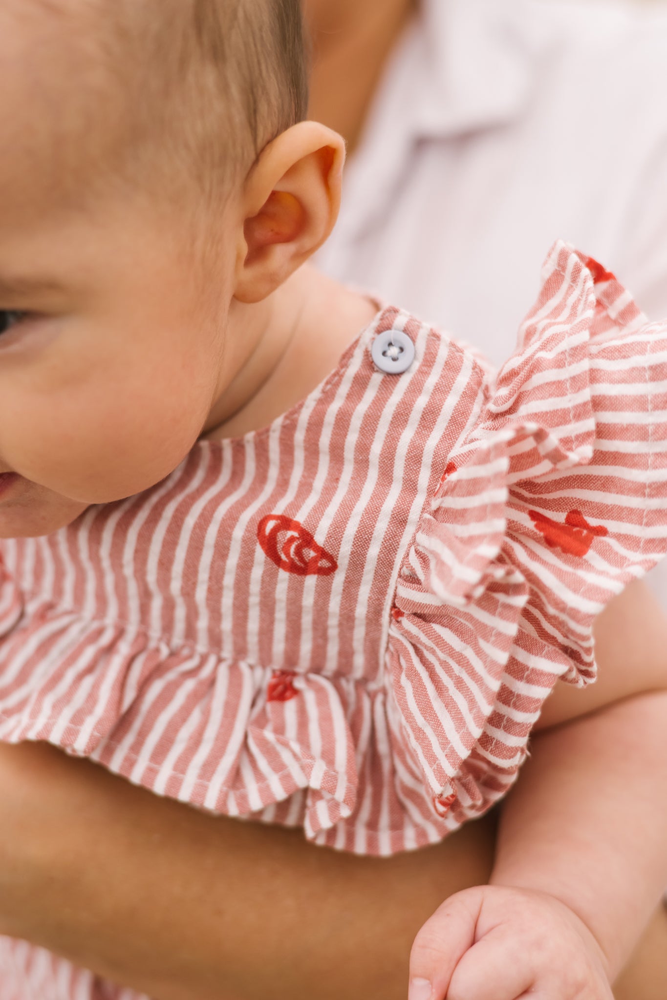 - Double ruffle sleeves with contrast button detail