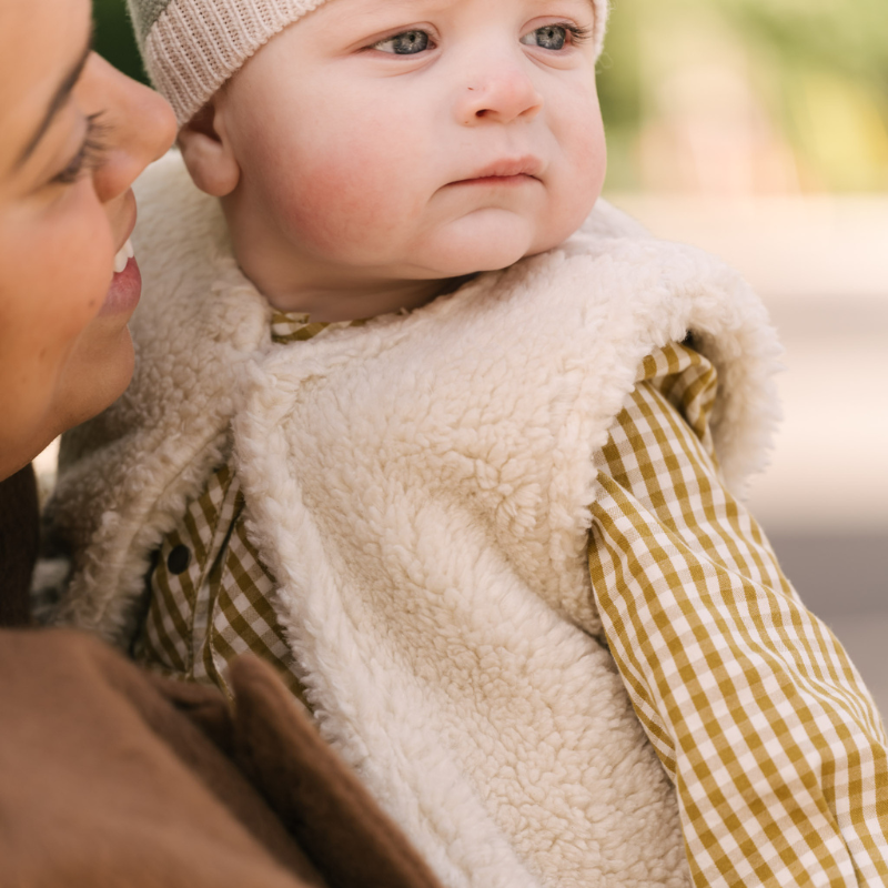 The coziest layer we ever did see. Our Sherpa Vest is the first of its kind — designed to wear over tops and dresses, for her or for him. With a classic fit and front button-loop closure to keep them snug, this versatile piece is made from a soft cotton blend with a full sherpa lining for extra warmth. Thoughtful details like the interior name label make it as practical as it is adorable — perfect for every little adventure.