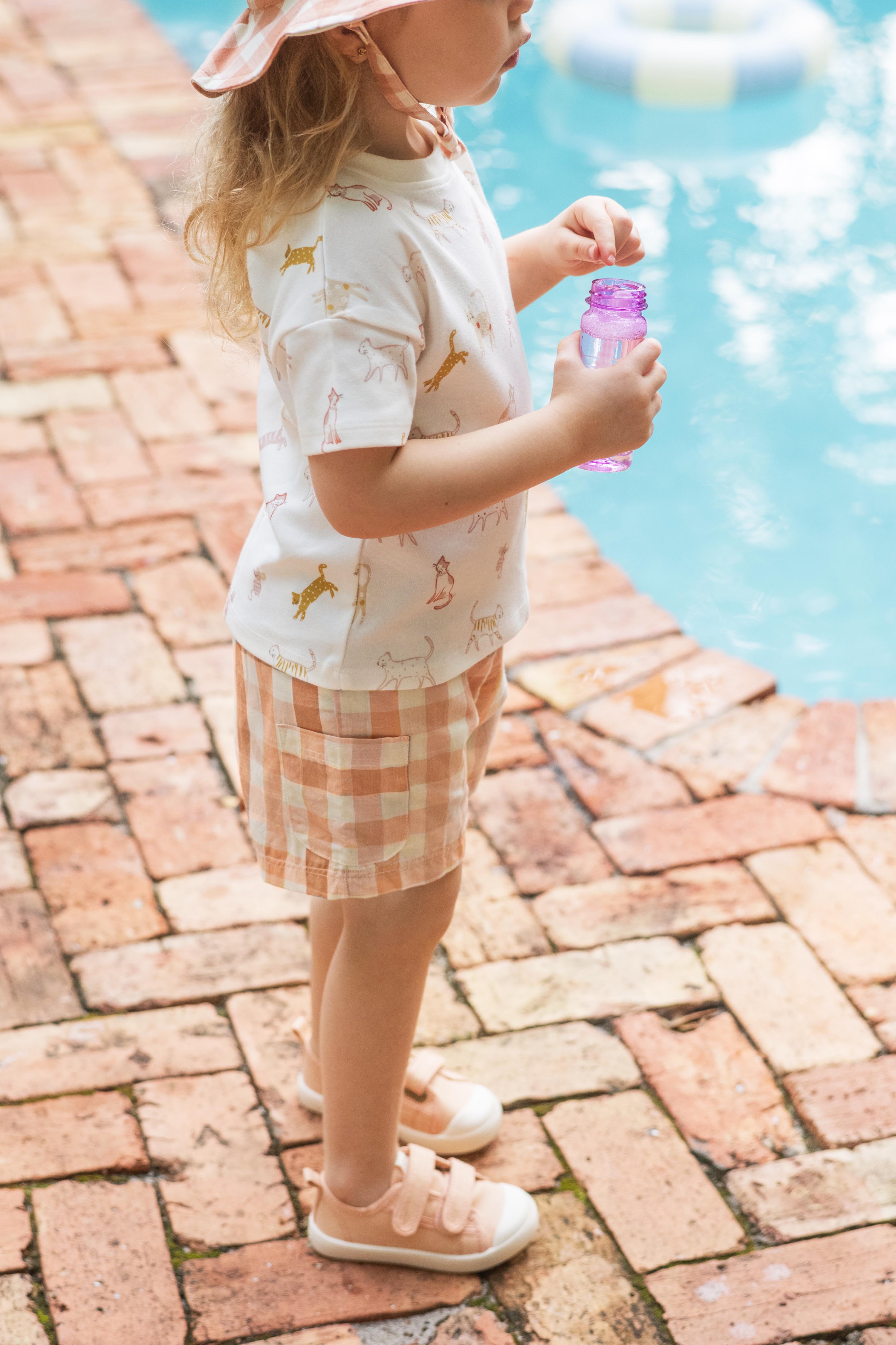 A warm-weather go-to for every little explorer. Anchor any outfit with our Checkmate Short—easy to dress up or down for summer adventures. Designed to ‘pehr’ with our Toddler Tops and Sandals, these shorts are lightweight, thoughtfully tailored, and made from GOTS certified 100% woven organic cotton. An elastic waistband keeps them comfy, while side patch pockets are just right for tiny treasures.