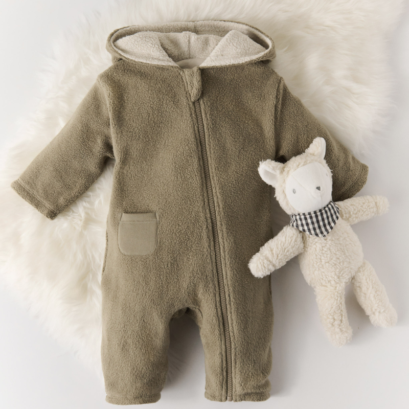 With its oversized hood and jersey-lined interior, this teddy fleece baby suit keeps your little one snug from stroller strolls to outdoor play.