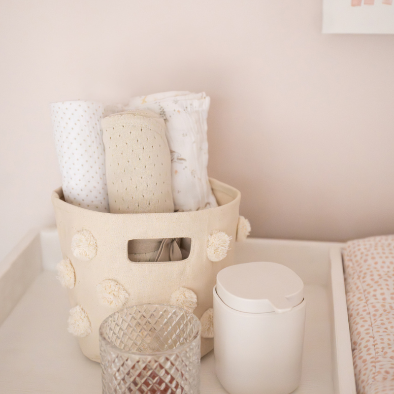 - Pom Pom Pint Storage basket keeps tummy time toys organized