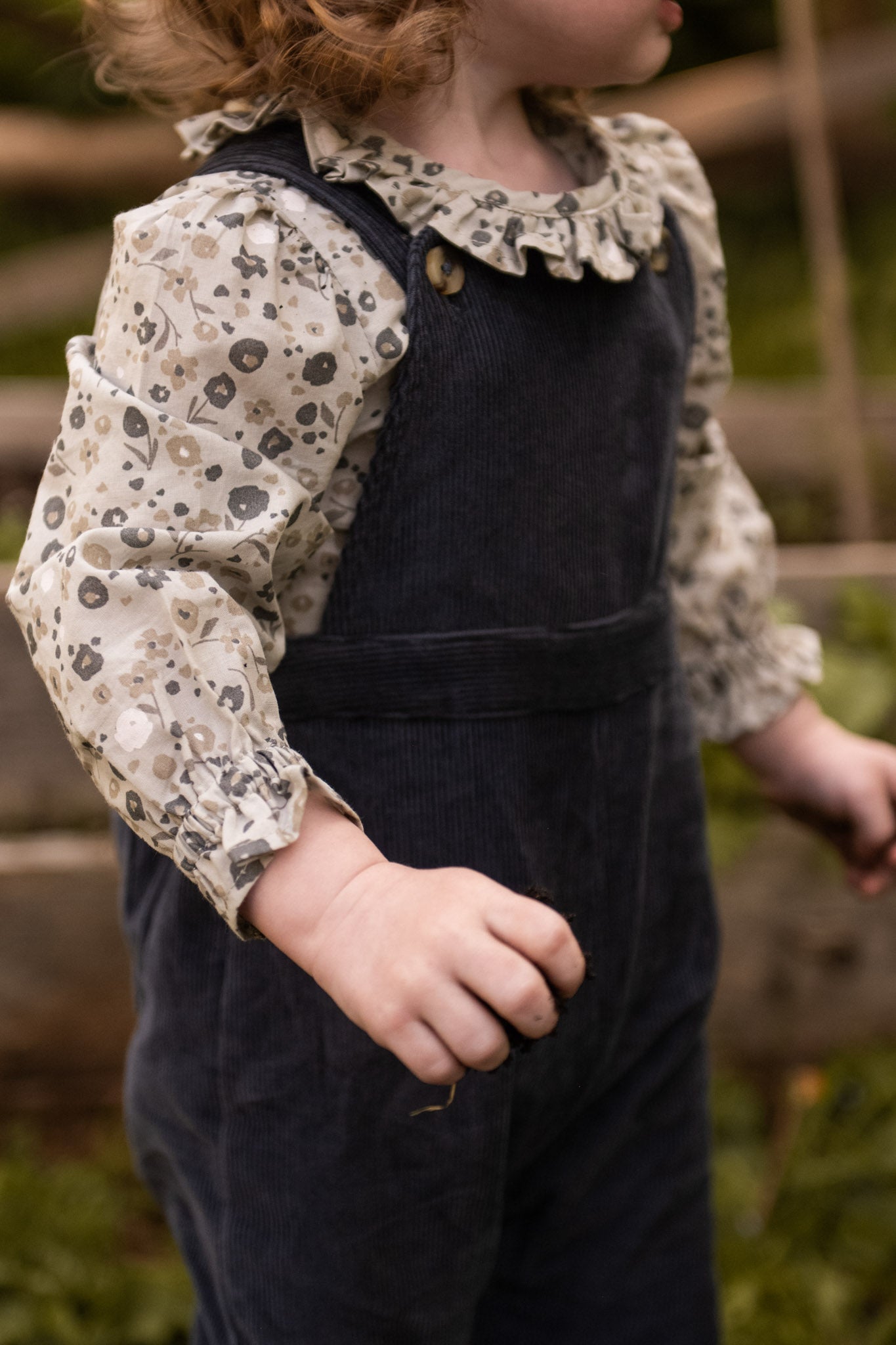 A sweet and timeless one-piece for every occasion. Made from soft, lightweight woven organic cotton in our signature Forget-Me-Not print, this charming one-piece features a delicate ruffle collar made from lightweight organic cotton cambric. Designed with elasticated cuffs and puff sleeves, it has a gently bubbled silhouette for a sweet, airy look. Snaps at the back of the neck and bottom make for easy dressing and diaper changes. Pehr with our Corduroy Skirt and Recess Sneakers to complete the look.